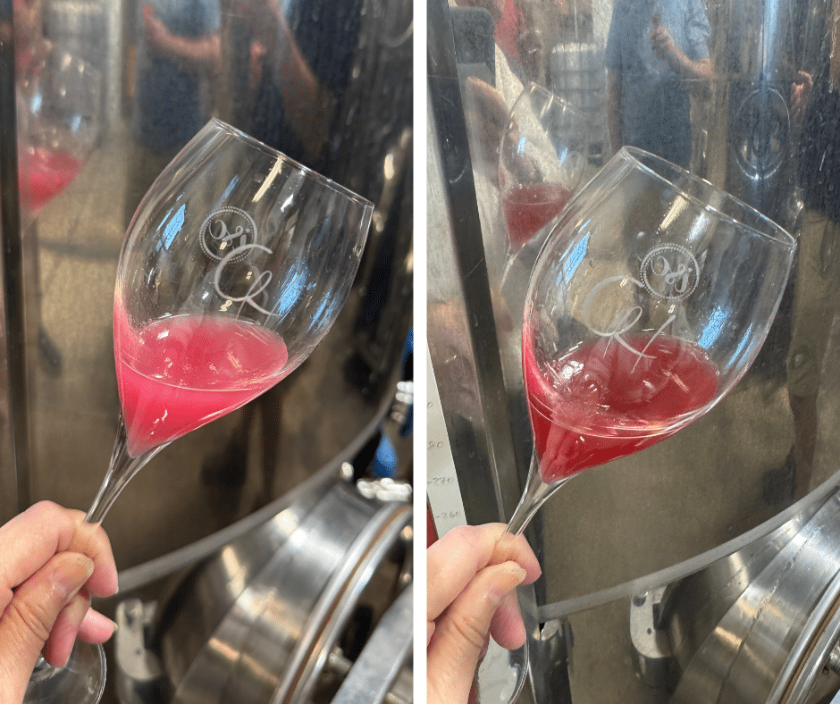 Even though we have all the juice that we want out of the grape for sparkling wine, there is still a lot of juice left in the grape. Being that we hate to see anything go to waste, we keep running press cycles up to about 1.5 bars. This juice is collected and called the “rebêche.” Unlike our cuvée, the rebêche is full of color & tannin structure. We are able to move the rebêche over to our still wine program at our sister winery, August Hill Winery. In the picture below, the glass on the left is Chambourcin cuvée that is the base for ISC Brut Ombré Rosé and ISC Pét Nat Rosé. On the right, the glass contains Chambourcin rebêche. The cuvée is acidic, bright, and tastes similar to not-quite-ripe raspberries. The rebêche is weighty, full of tannin, and tastes like dark plums and spice.